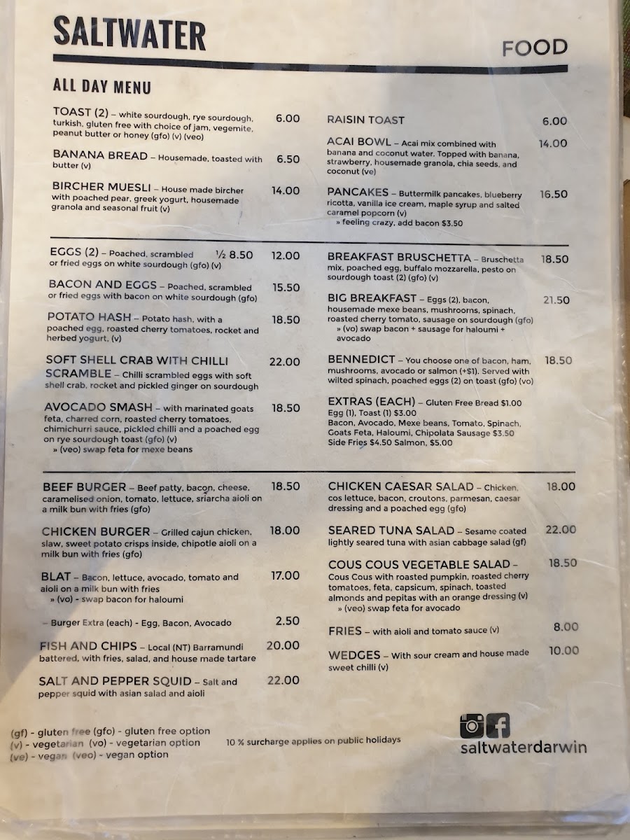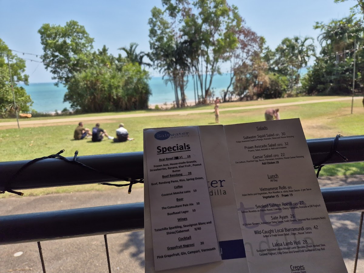 The atmosphere of Saltwater is truly enchanting. Picture yourself seated in the covered outdoor area, with a gentle breeze and cooling fans making the tropical heat entirely manageable. The Melbie noted how lovely it was to watch the antics of the local wildlife as they waited for their meal, a perfect escape for those with a sense of adventure and a love of nature.